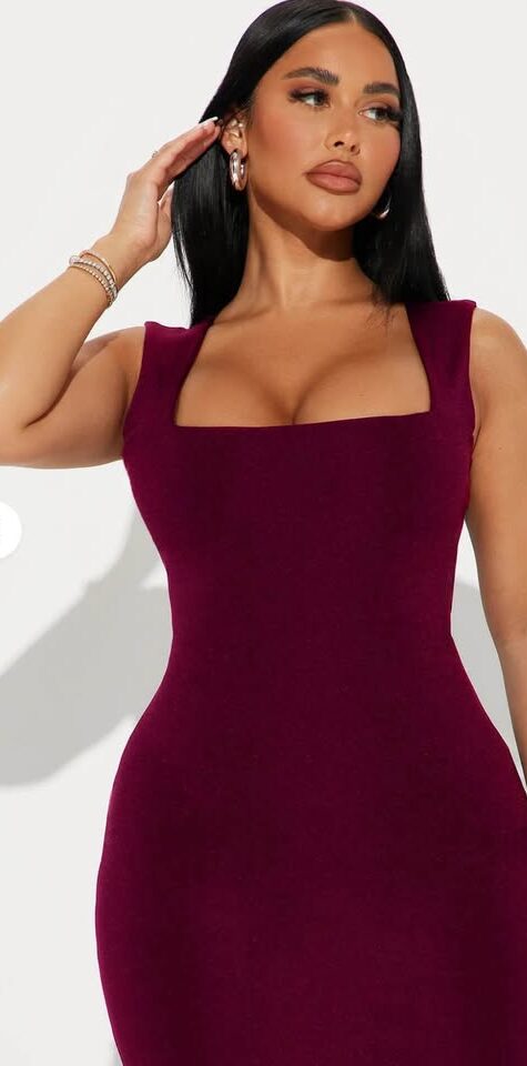 • Available In Black, And Wine. Midi Dress Sleeveless Square Neckline