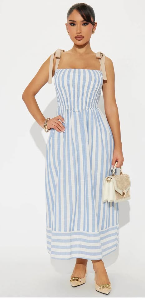 - Available In Blue/combo. Striped Linen Midi Dress Scoop neckline Tie shoulder Smocked Lined Stretch Length measured flat = 44″ Self: 50% Cotton 50% Polyester Contrast: 50% Cotton 30% Linen 20% Polyester Lining: 100% Polyester Imported