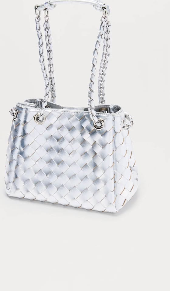 Available In Silver. Shoulder Handbag Woven Detail Faux Leather Metallic FInish Magnetic Top Closure Imported
