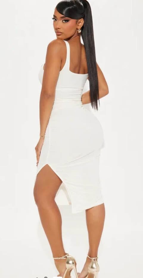 • Available In White. Ruched Midi Dress Sleeveless Square Neckline Ruched Side Slit Double Lined Stretch Self: 95% Polyester 5% Spandex Lining: 100% Polyester Imported