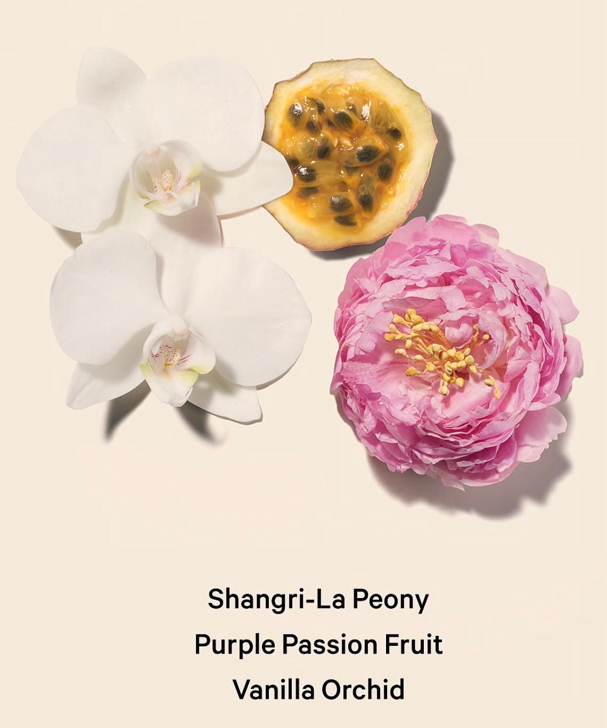 Notes: purple passion fruit, Shangri-La peony, vanilla orchid
